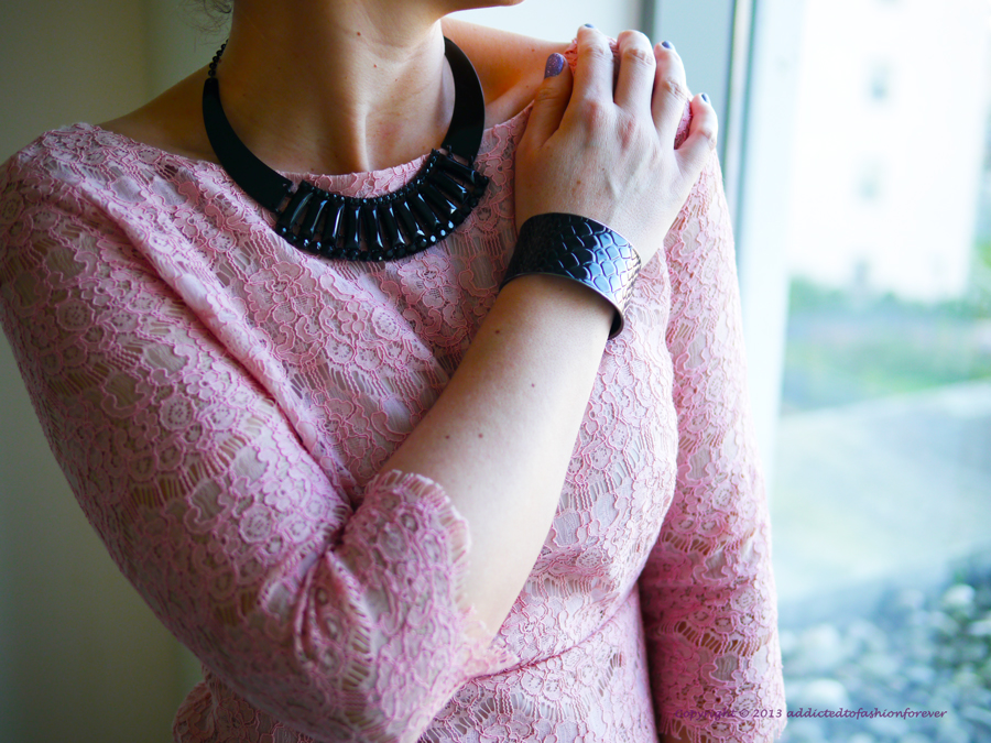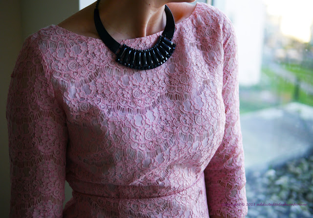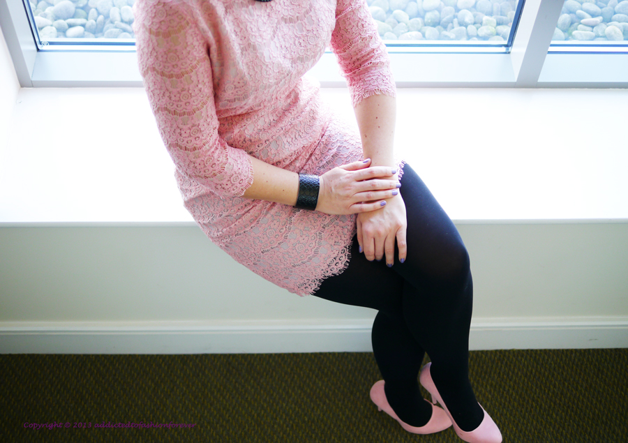 Continuing Xmas and New Year's Eve theme I'm presenting another styling option. Combination of powder pink lace mini dress and black accessories.